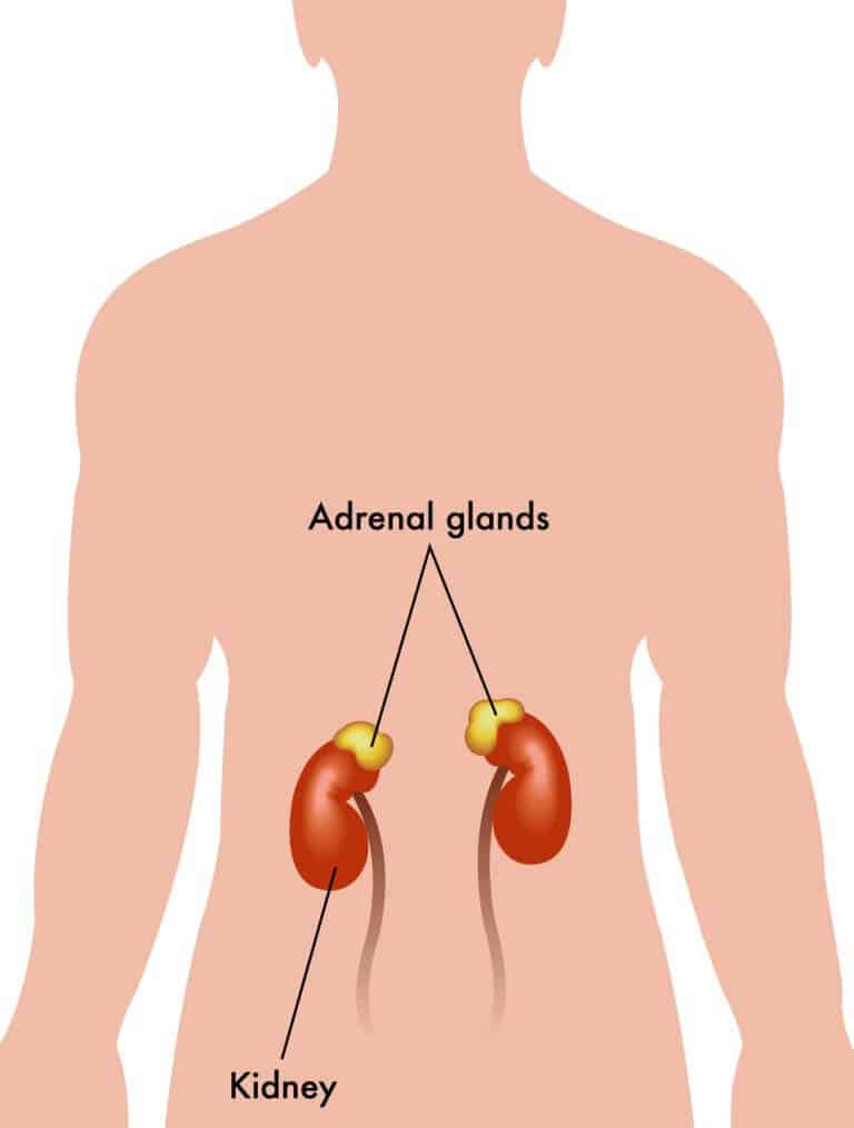 The adrenal glands are important little glands that sit atop the kidneys.  They secrete the hormones that maintain blood sugar, blood salt, and energy levels during periods of stress.